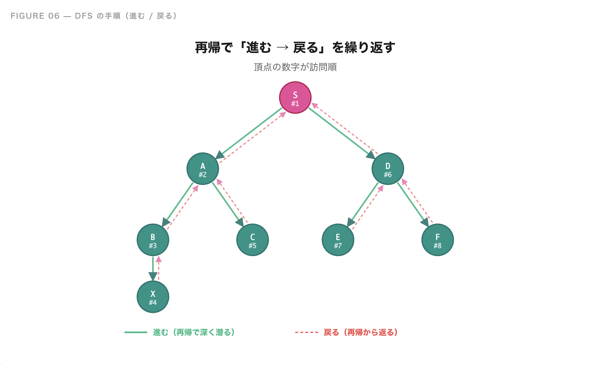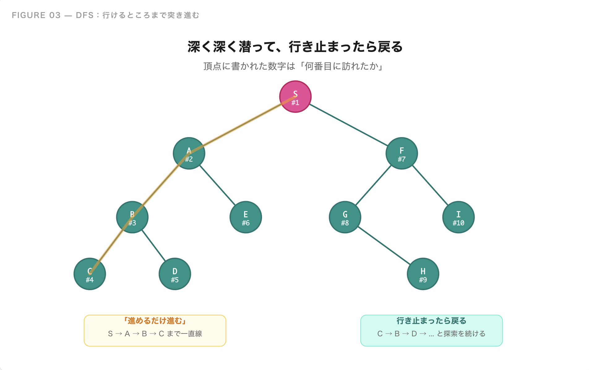 これが**深さ優先探索(DFS)**の考え方です。深く、深く潜っていって、ダメなら戻る。これだけのシンプルな作戦です。