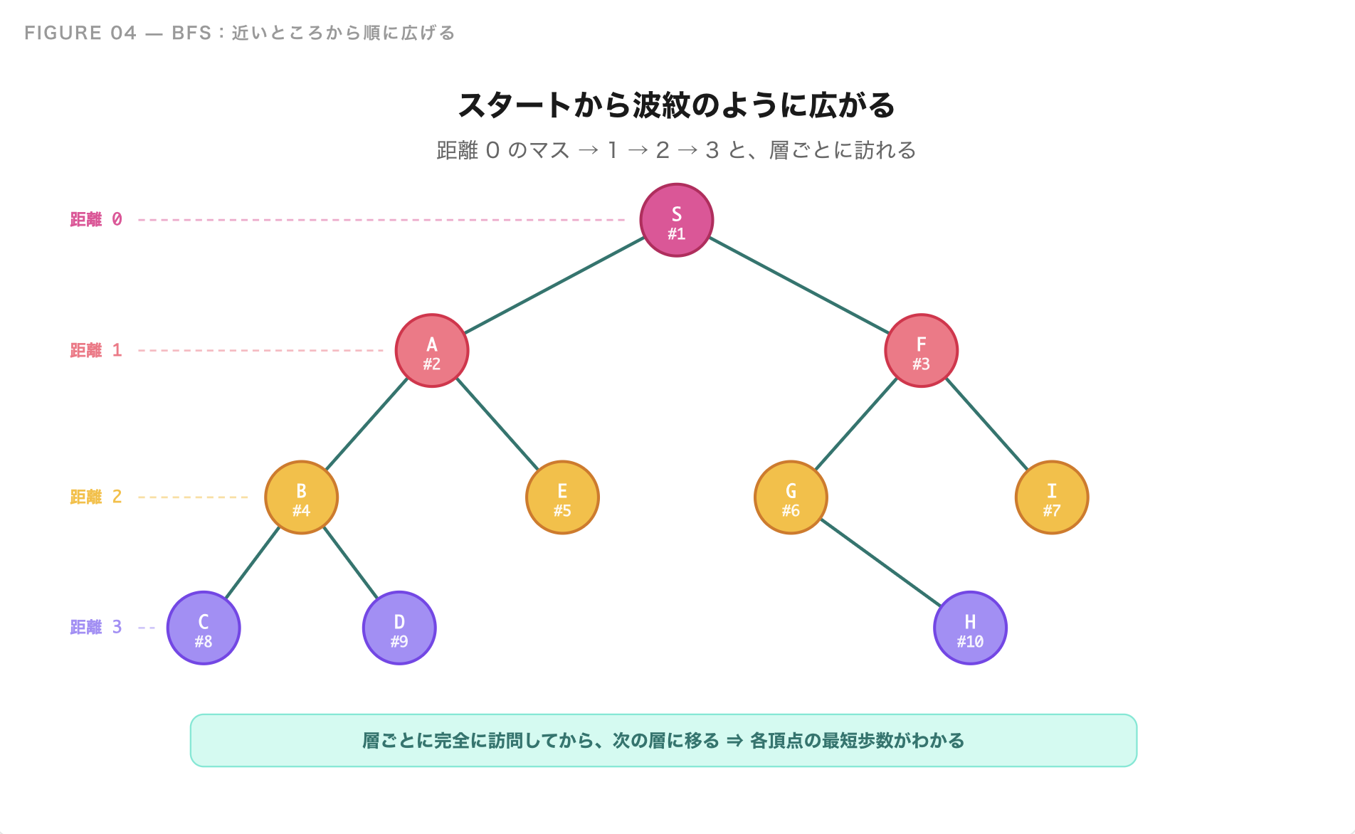 これが**幅優先探索(BFS)**の考え方です。スタートから波紋が広がるように、幅(横方向)に広く探していくイメージです。