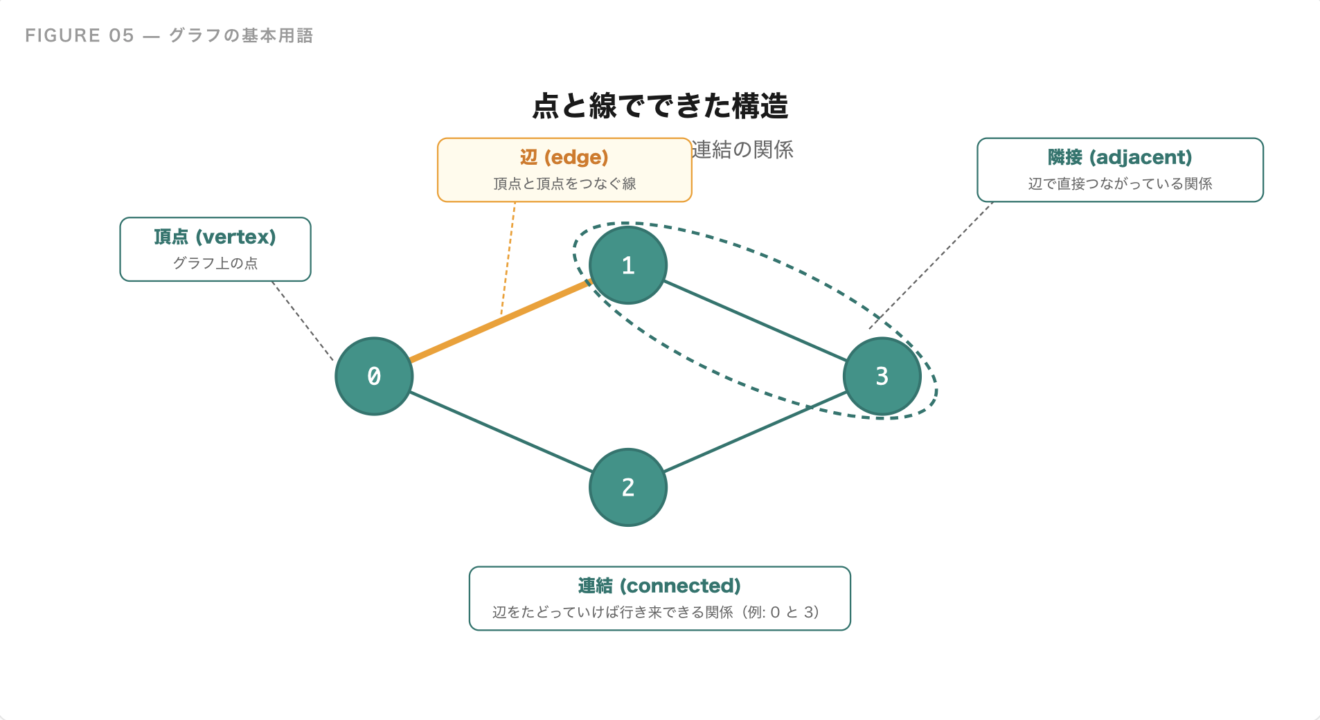- 頂点(vertex / node):グラフ上の点。番号 0, 1, 2, ... で管理することが多い