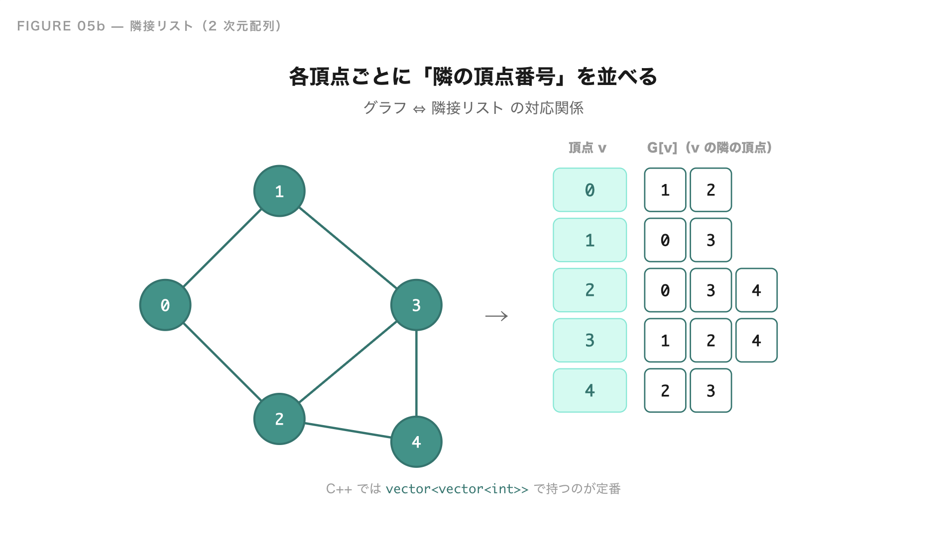 G 全体を見ると、「頂点番号 v」を行、「v の隣の頂点番号」を列にした 2 次元配列になっていることがわかります。各行の長さは頂点ごとに違っていてよく(その頂点の隣の数だけ要素を持つ)、C++ では vector<vector<int>> で表現するのが定番です。