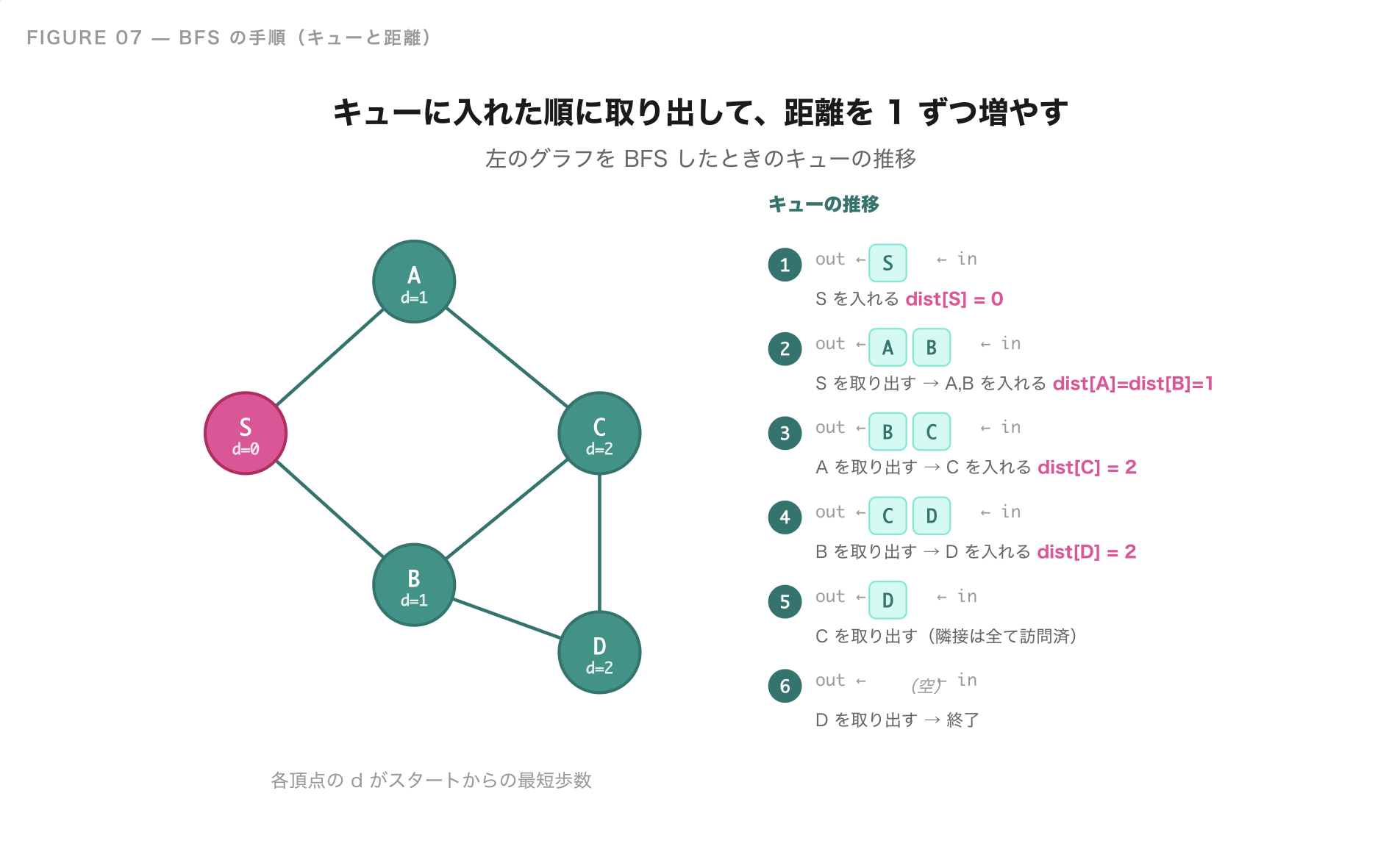 BFS のすごいところは、これだけで**スタートから各頂点までの最短歩数(辺の重みが全部 1 のときの最短経路)**が一気に求まることです。迷路の最短経路問題は、ほぼこの形で解けます。