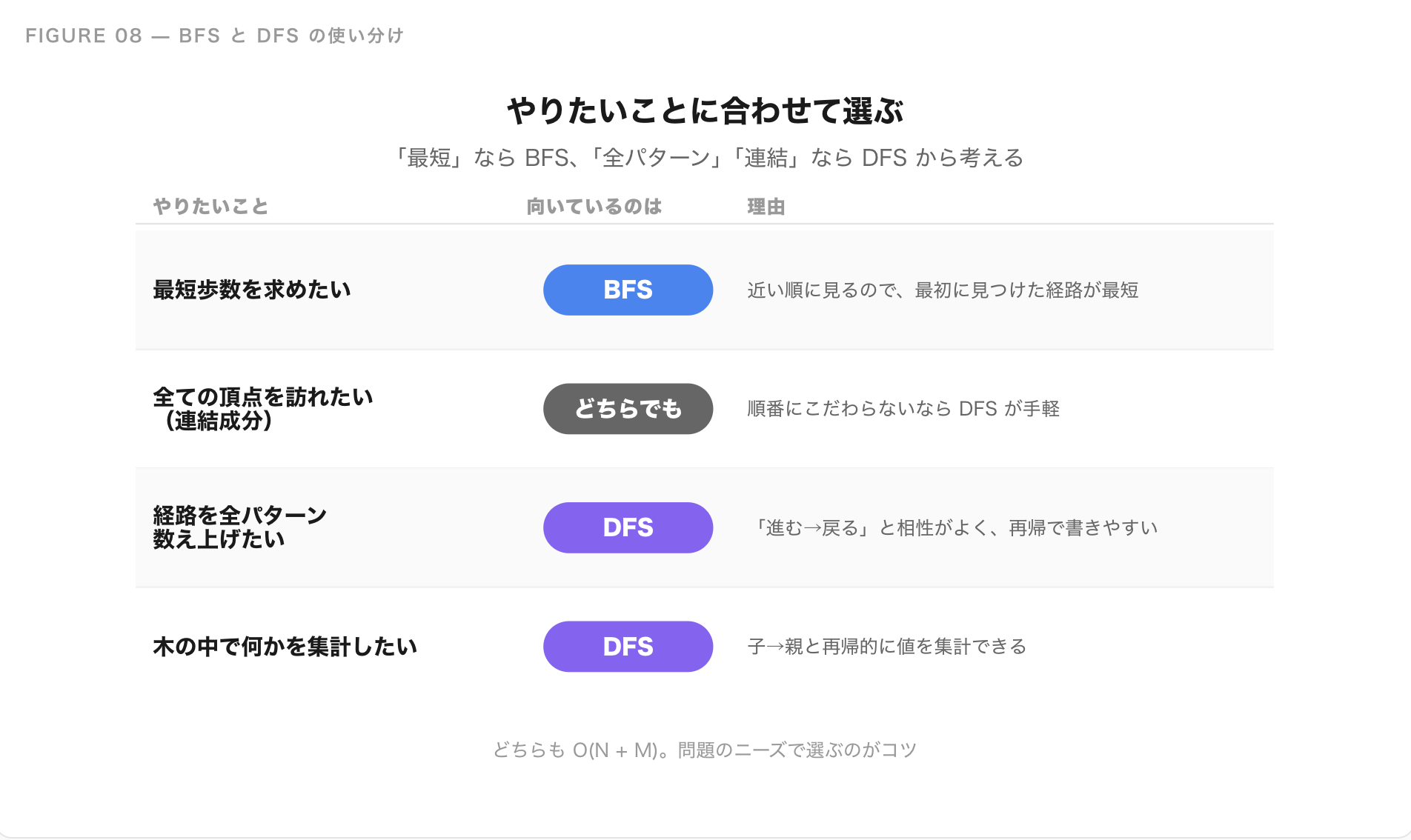 ざっくり言えば、「最短」と書いてあったら BFS、「全パターン」「連結」と書いてあったら DFS から考えると、迷う回数がぐっと減ります。