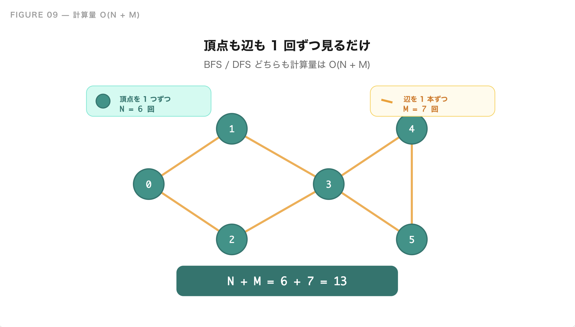 BFS と DFS は、どちらも全ての頂点と辺を 1 回ずつ見るだけで終わります。頂点数を N、辺数を M とすると、