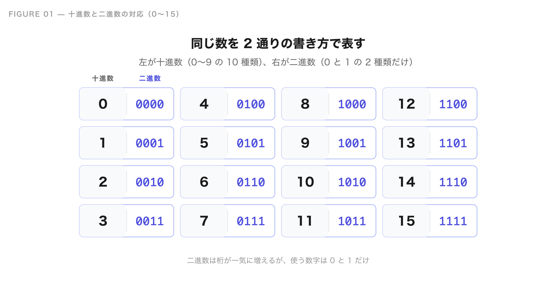 普段私たちが使っているのは十進数で、0〜9 の 10 種類の数字を使って数を表します。それに対して二進数は、0 と 1 だけですべての数を表現します。