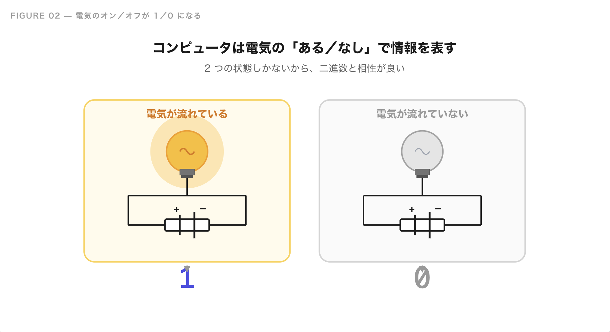 コンピュータは電気で動いていて、電気の「流れている/流れていない」という 2 つの状態を使って情報を表しています。この 「流れている = 1 / 流れていない = 0」 が、二進数の本質です。
