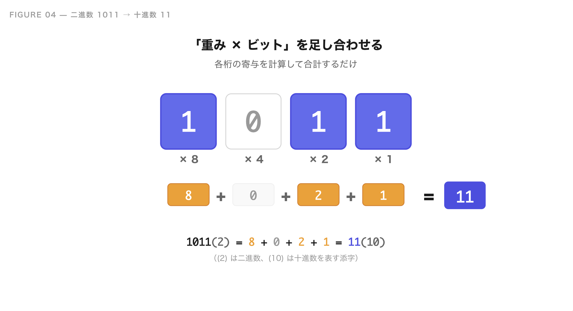たとえば二進数 1011 を十進数に変換してみます。各桁の「重み × ビット」を足し合わせるだけです。