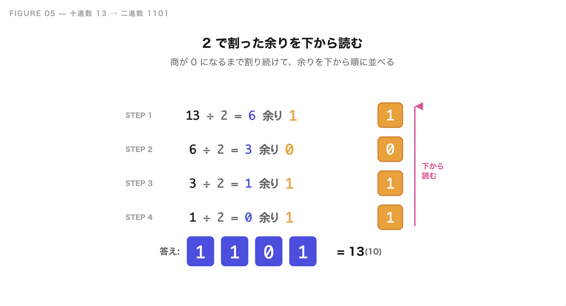 割り切れなくなる(商が 0 になる)まで繰り返して、余りを下から順に読み上げると 1101。というわけで、十進数 13 は二進数で 1101 です。