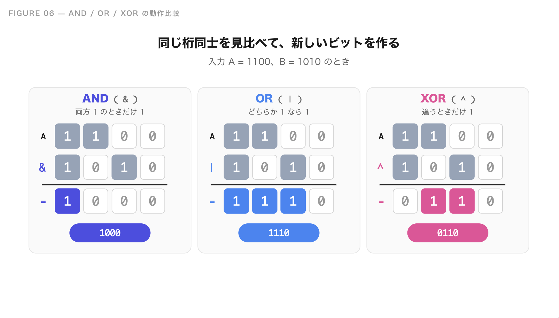 この 3 つは、2 つの数の同じ桁同士を見比べて、新しいビットを作る演算です。