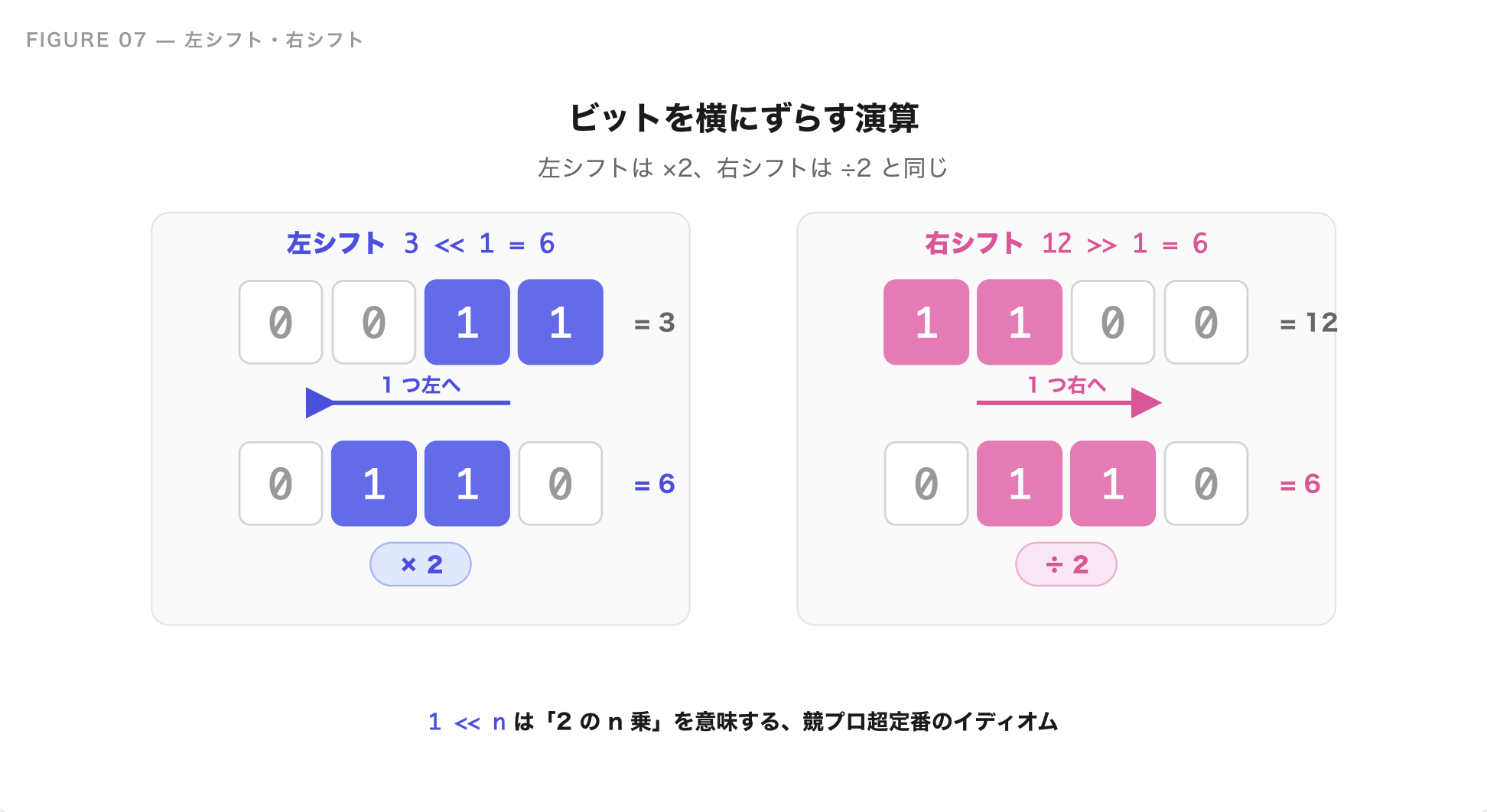 x << n:xのビットを n だけ左にずらす(=x × 2ⁿと同じ)x >> n:xのビットを n だけ右にずらす(=x ÷ 2ⁿと同じ、切り捨て)